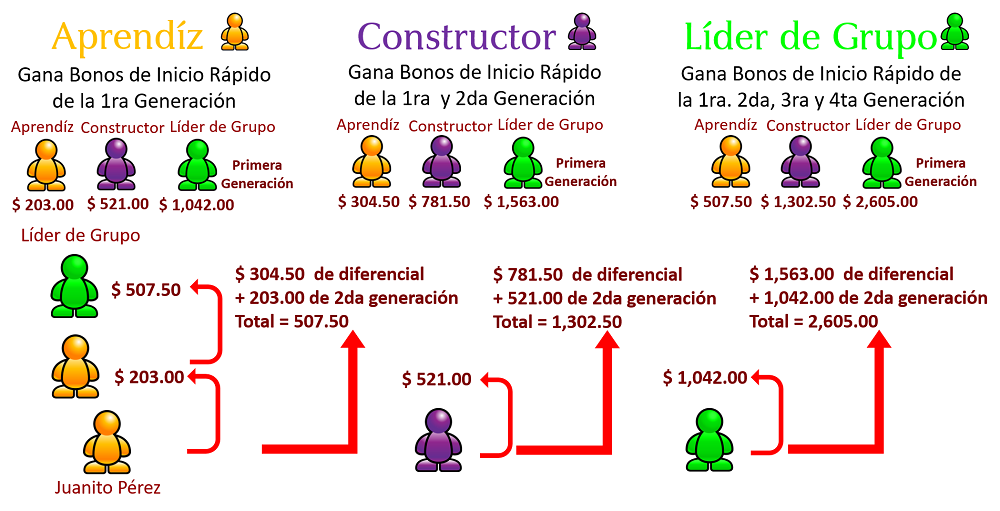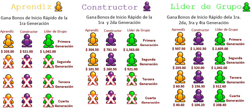 Al ingresar con un paquete Aprendíz, Constructor o Líder de Grupo calificas para ganar bonos de inicio rápido del paquete que hayas elegido. Cada paquete paga determinadas generaciones y el bono se pagará de acuerdo al paquete de inicio que tus asociados compren, NOTA: Para cambiar de Rango necesitarás actualizar o adquirir un nuevo paquete.