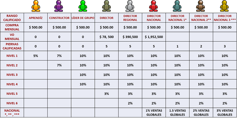 tú paquete de inscripción determina el rango de liderazgo con el que inicias tú carrera, para avanzar de rango deberás comprar un paquete de actualización que te califiqué con el nuevo rango ó construir una organización cumpliendo los requisitos de volumen organizacional como se muestra en la tabla de bono residual.